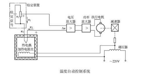 如果將控溫過程中的人工操作 (檢測和調節) 換由自動控制裝置完成,則成為包裝機自動控溫系統。如下圖所示,檢測元件熱電偶檢測恒溫箱內的溫度,并將溫度轉換為對應的電壓信號2 ,同時反饋給比較器。比較器比較表示給定溫度的給定電壓信號1與檢測電壓信號2的大小,得到溫差信號,其大小和正負代表溫差的大小和方向。溫差信號△經電壓放大和功率放大后,控制執行電機的轉速和方向,執行電機通過傳動裝置拖動調壓器觸頭調節供熱電壓。當溫度偏高時,動觸頭向著減小電壓( 電流)方向轉動; 反之,當溫度偏低時,動觸頭則向著增大電壓( 電流)方向運動,直至恒溫箱內溫度達到給定溫度,溫差信號△=0 時觸頭停止運動。