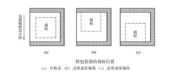在包裝作業過程中,卷筒半徑逐漸減小,包裝紙所受張力發生變化,送紙輥與包裝紙之間的摩擦因數受環境溫濕度的影響而發生波動,加上商標印刷誤差,以及送紙、縱封、橫封、切斷各部分速度的差異等因素,使得刀輥的實際切線偏離規定部位。即使這種位置誤差很小,例如在某—包裝袋上只偏差0.1mm,但包裝機速度很快,有的高達200包/min, 如不加以控制調節,機器運行1垃i六 后,誤差積累可達20mm,切線嚴重偏離規定部位,降低了包裝質量,甚至造成廢品。如圖所示,圖(a)為合格品; 圖 (b) 為送紙速度偏低,商標后移; 圖 (c) 為送紙速度偏高, 商標前移。 為了保證包裝袋的正確封切, 必須在卷筒紙供送系統中, 引人商標圖案自動位置檢測與控制系統。目前應用廣泛的是光電自動定位系統。